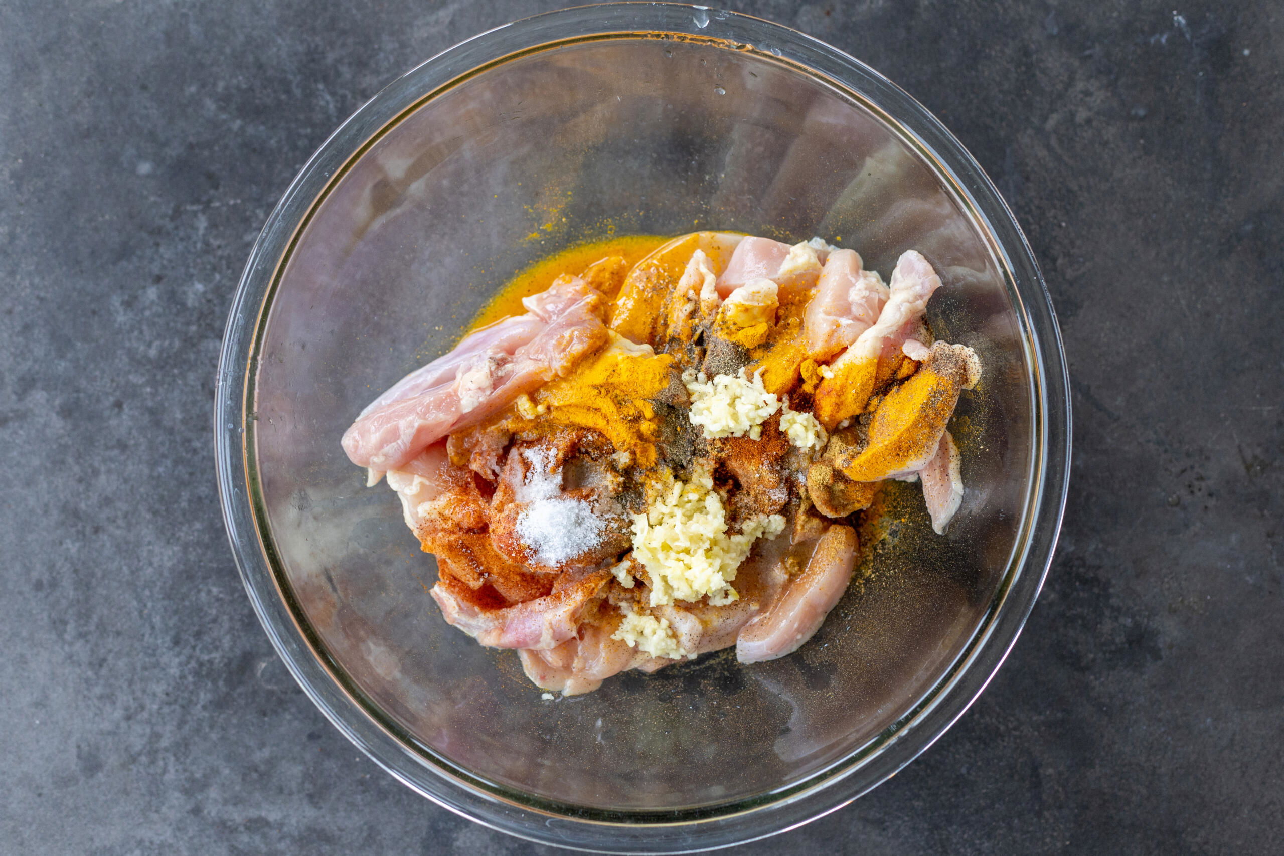 - Add the lemon juice, garlic, spices, and olive oil. Toss until the chicken is evenly coated. Cover and marinate for at least 1 hour or up to overnight.