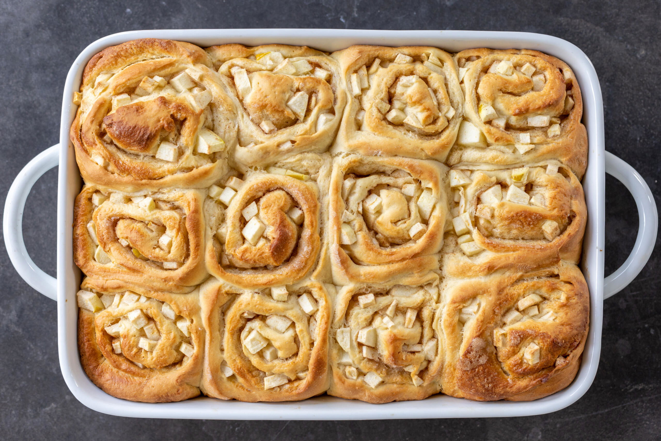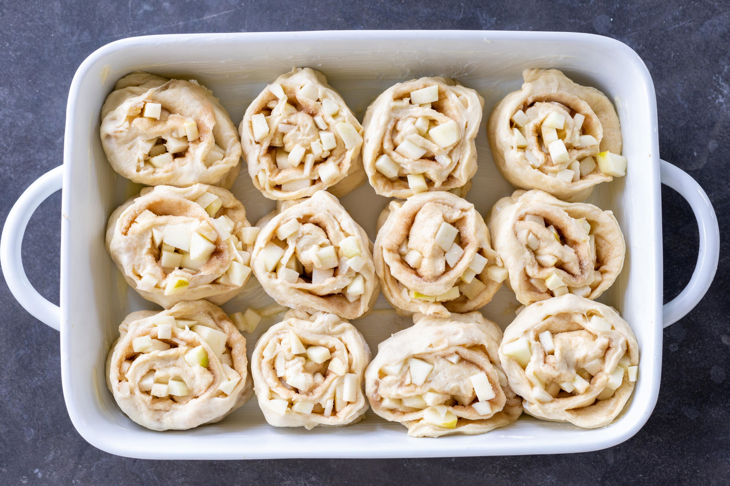 - Assemble the rolls: On a floured work surface,roll out the dough into a large rectangle. Add the melted butter, cinnamon sugar, and diced apples. Roll the dough tightly into a log, then cut it into 12 even pieces.