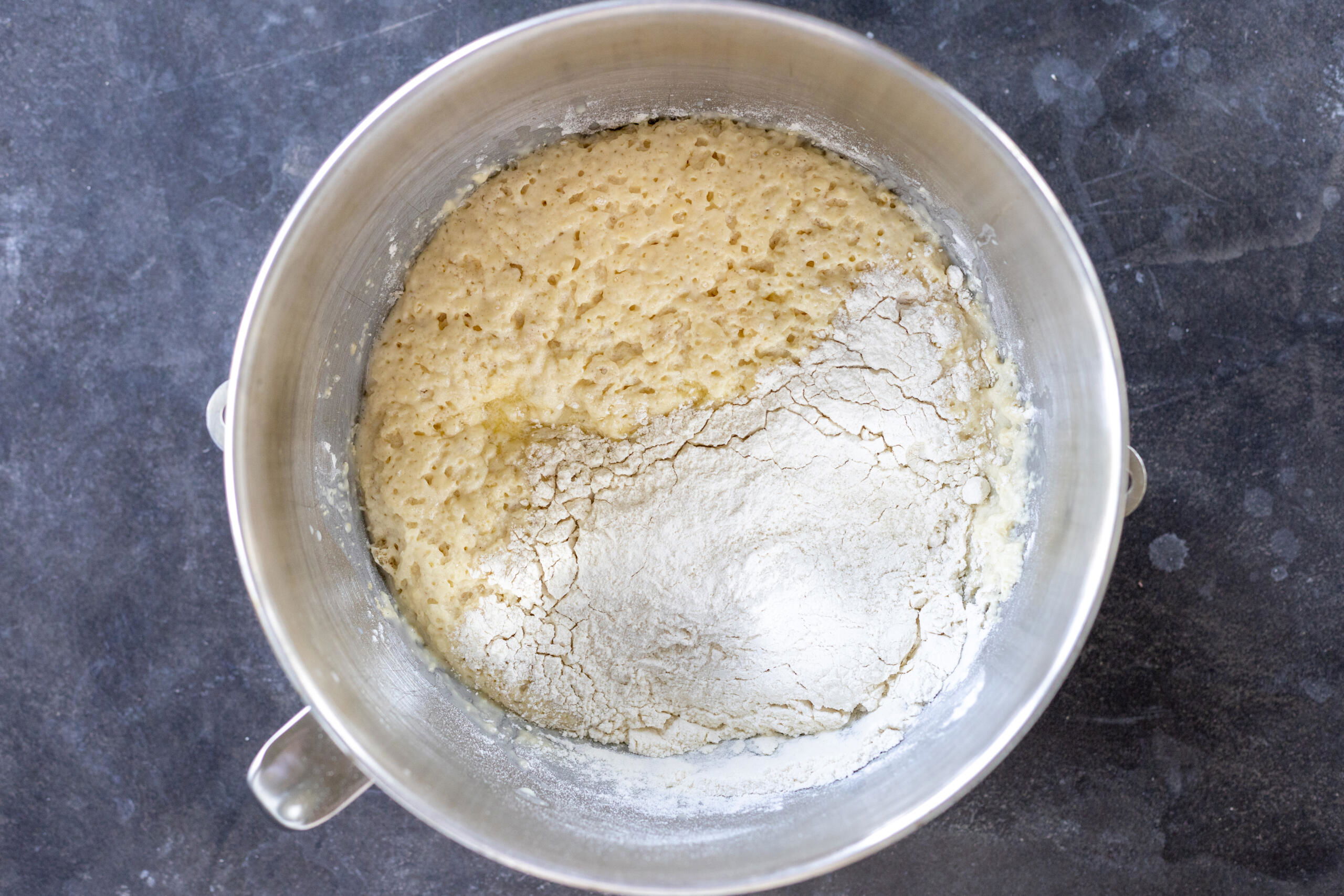 - Mix and knead the dough: Whisk in the eggs, salt, and melted butter. Gradually add the remaining flour, then knead the dough on medium speed for about 10–15 minutes.