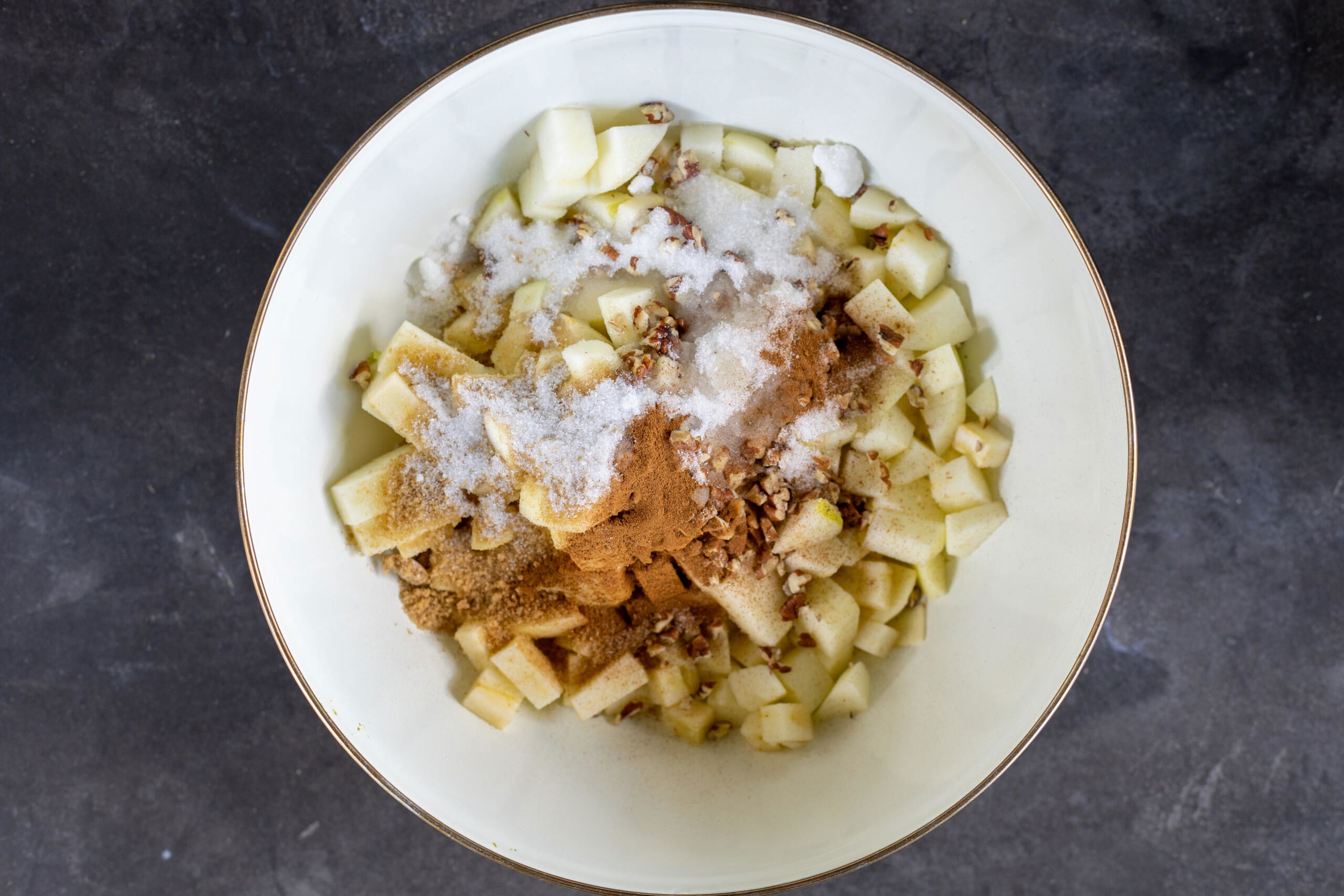 - To make the filling, mix the cubed apples, granulated sugar, brown sugar, cinnamon, lemon juice, and chopped walnuts together in a bowl.