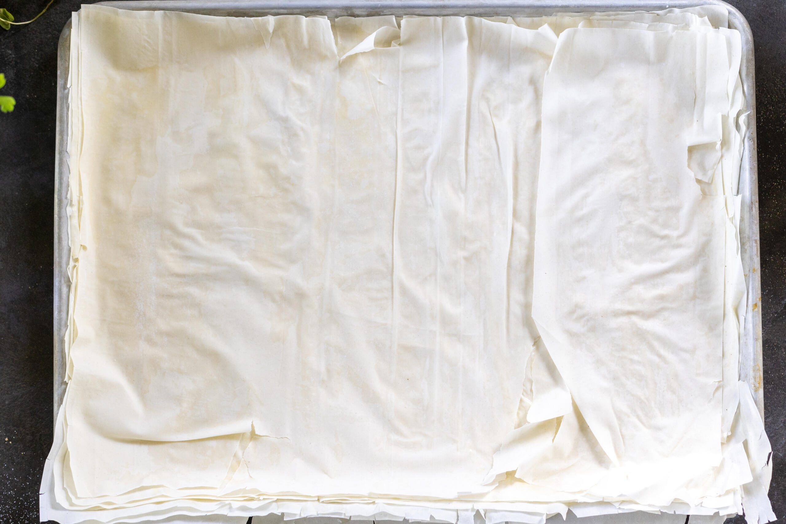 - Keep the phyllo covered. This is something I learned the hard way… phyllo dough is so thin that the edges start to dry out in as little as 15 minutes. While you’re stacking layers, keep the extra dough covered with a damp cloth.