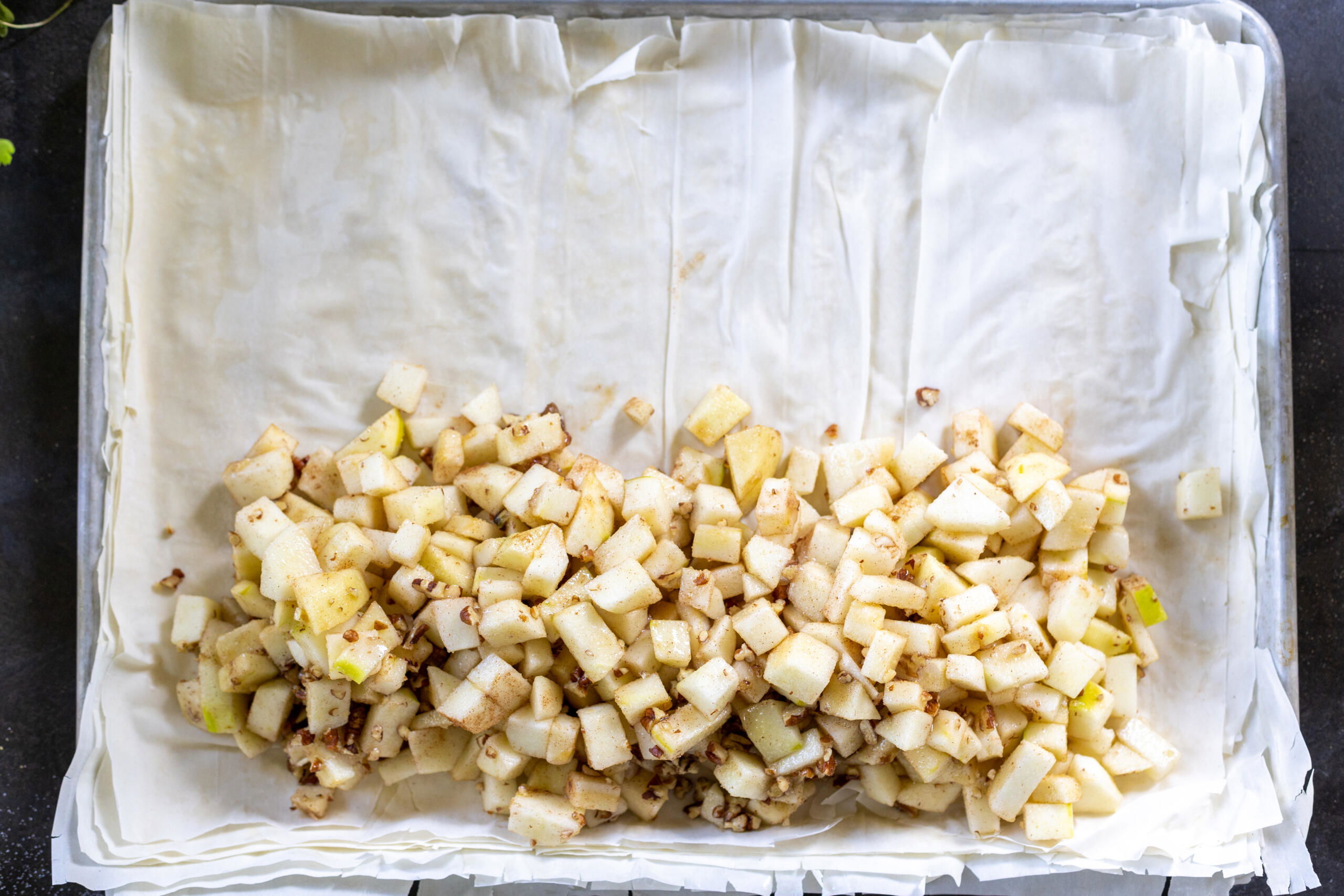 - Spoon the apple/walnut filling along one long edge of the stacked phyllo, leaving 2 inches at the sides.