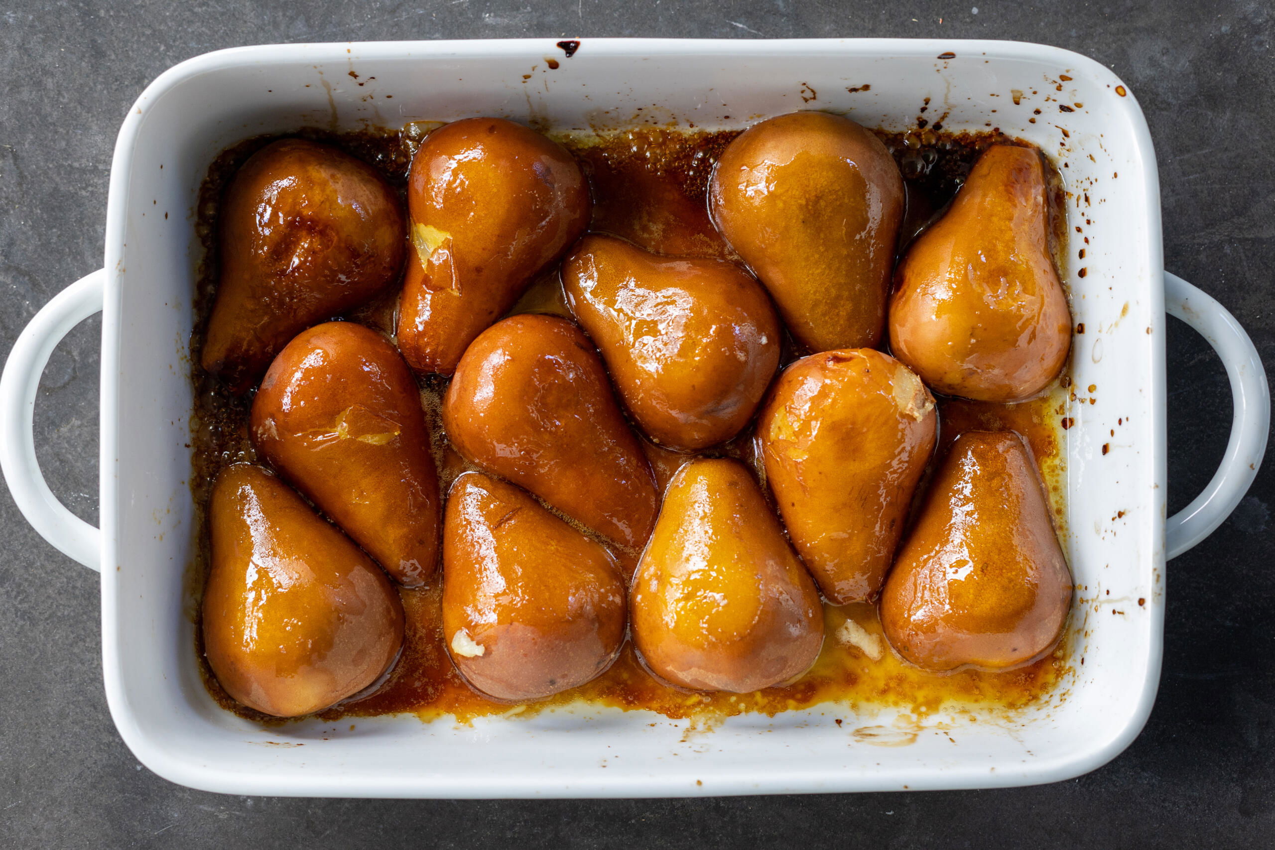 - Flip and baste the pears halfway. The juices at the bottom of the pan are liquid gold! Give the pears a flip and spoon those delicious juices on top halfway through baking for a beautiful, glossy finish.