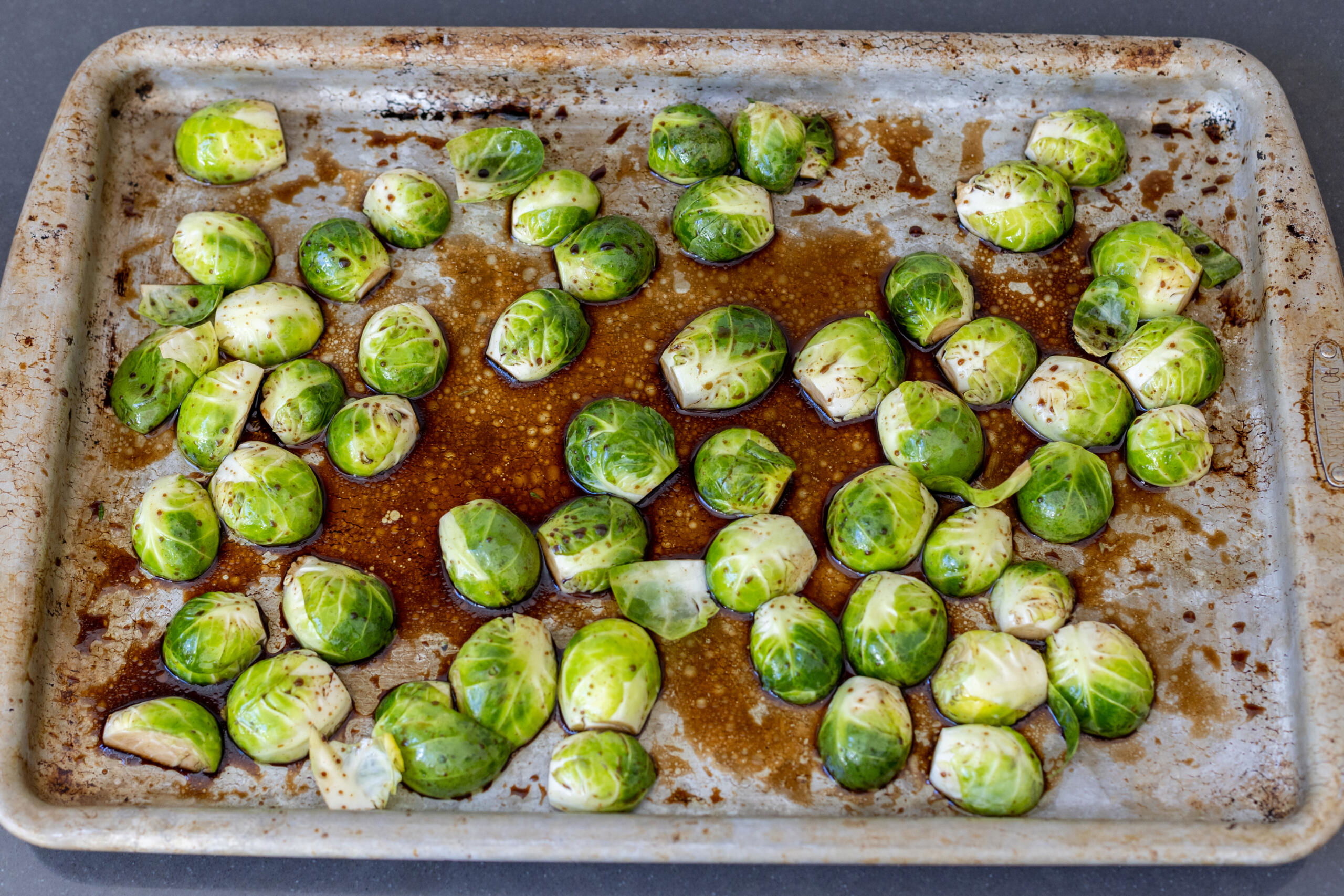 - Place the halved Brussels sprouts on a baking sheet and toss them with ⅔ of the dressing. Make sure all the sprouts are cut-side down.