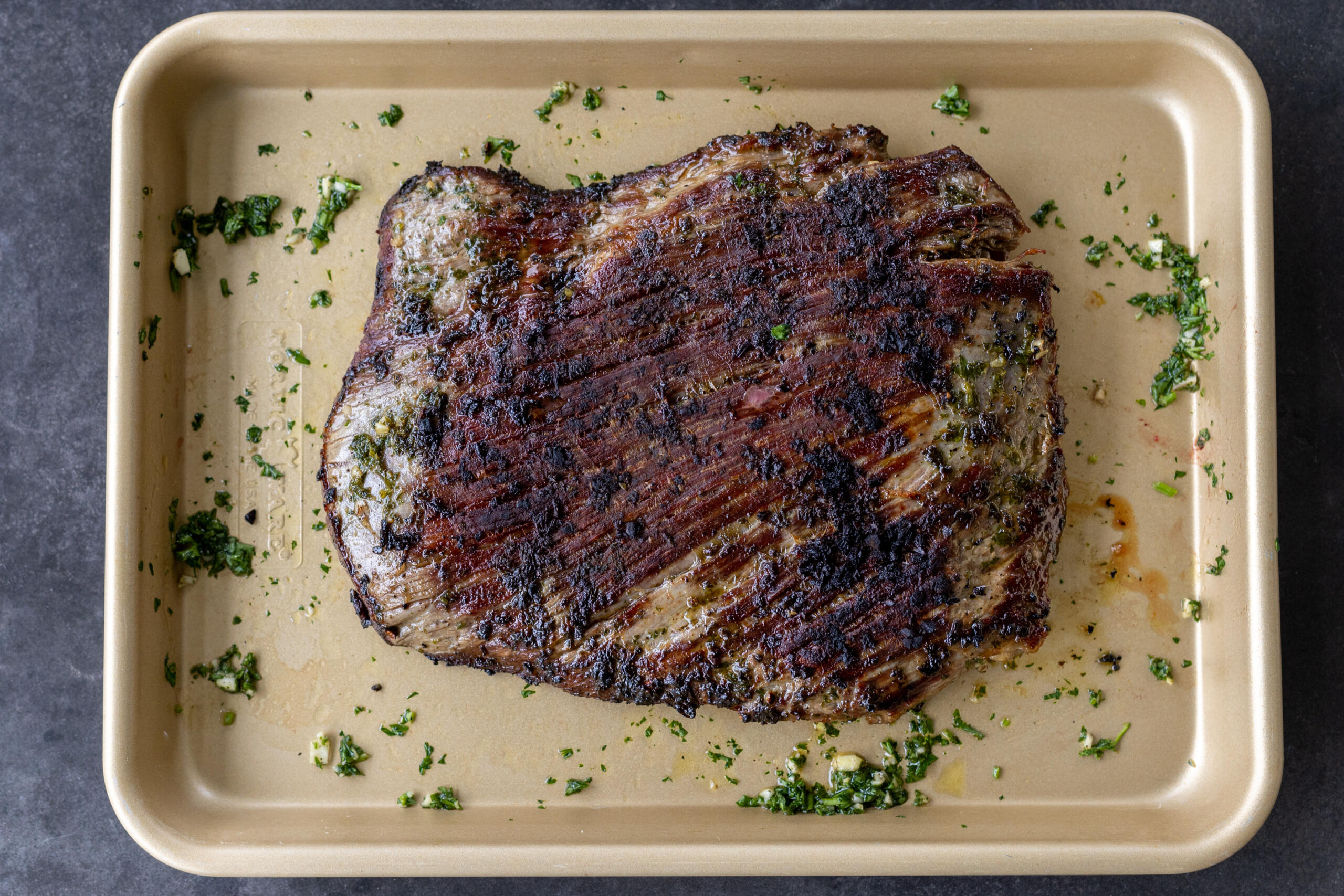 Chimichurri Steak sliced on a serving tray and herbs.