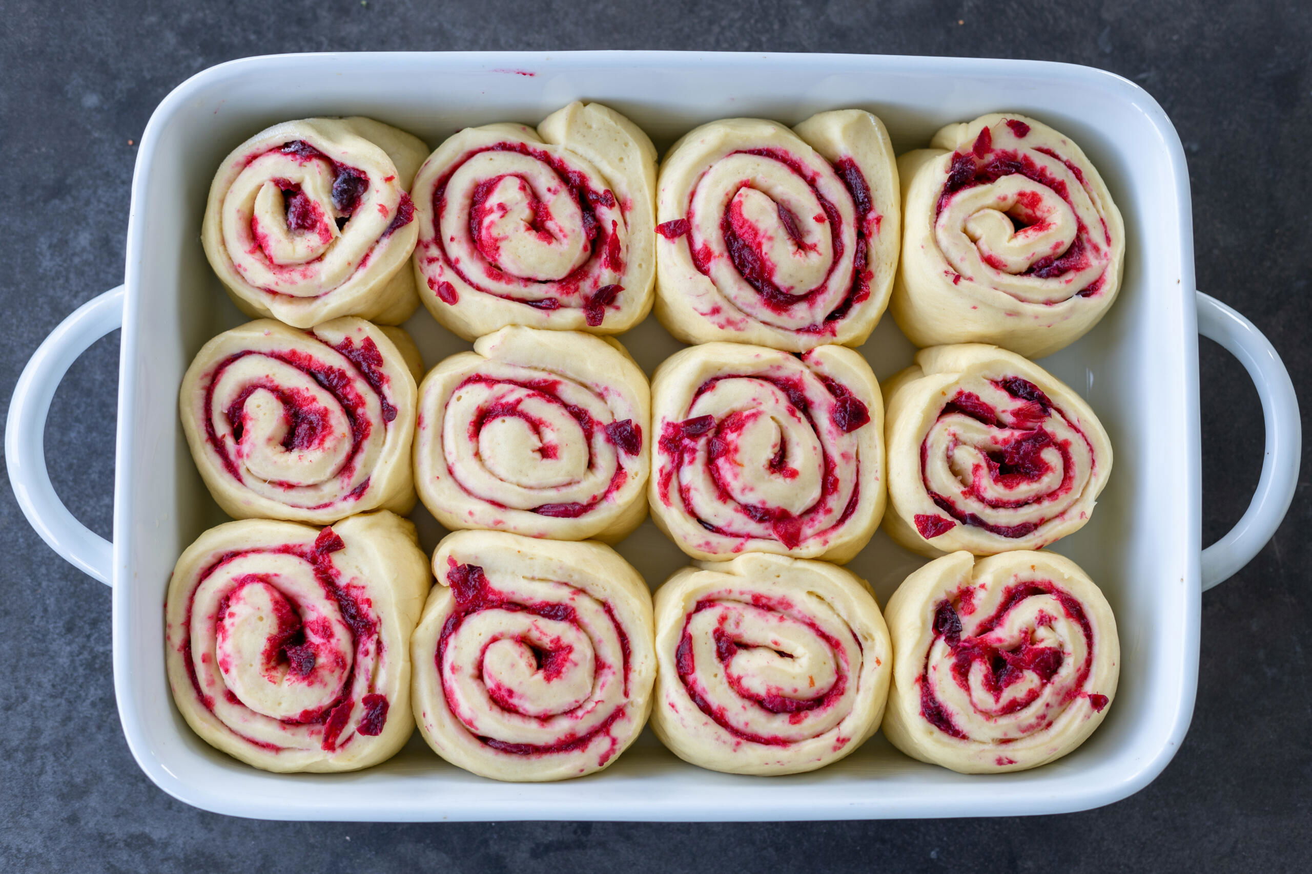 - Assemble the rolls: Roll the dough into a large even rectangle, then brush it with the melted butter and spread the cooled cranberry filling on top. Roll the dough into a log and slice it into 12 equal pieces.
