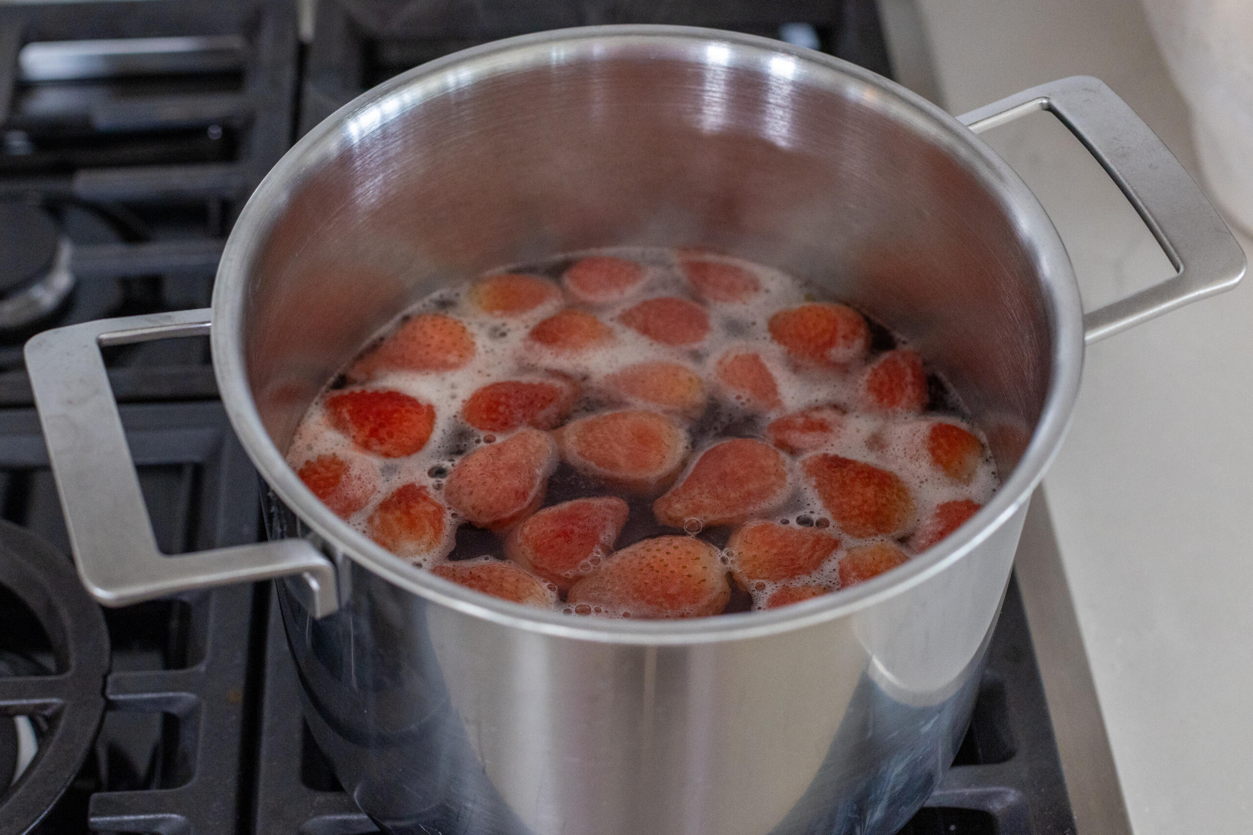 - Add the fruit to a large pot with 3 quarts of water. Bring the water to a boil, then reduce the heat and simmer for about 10 minutes.