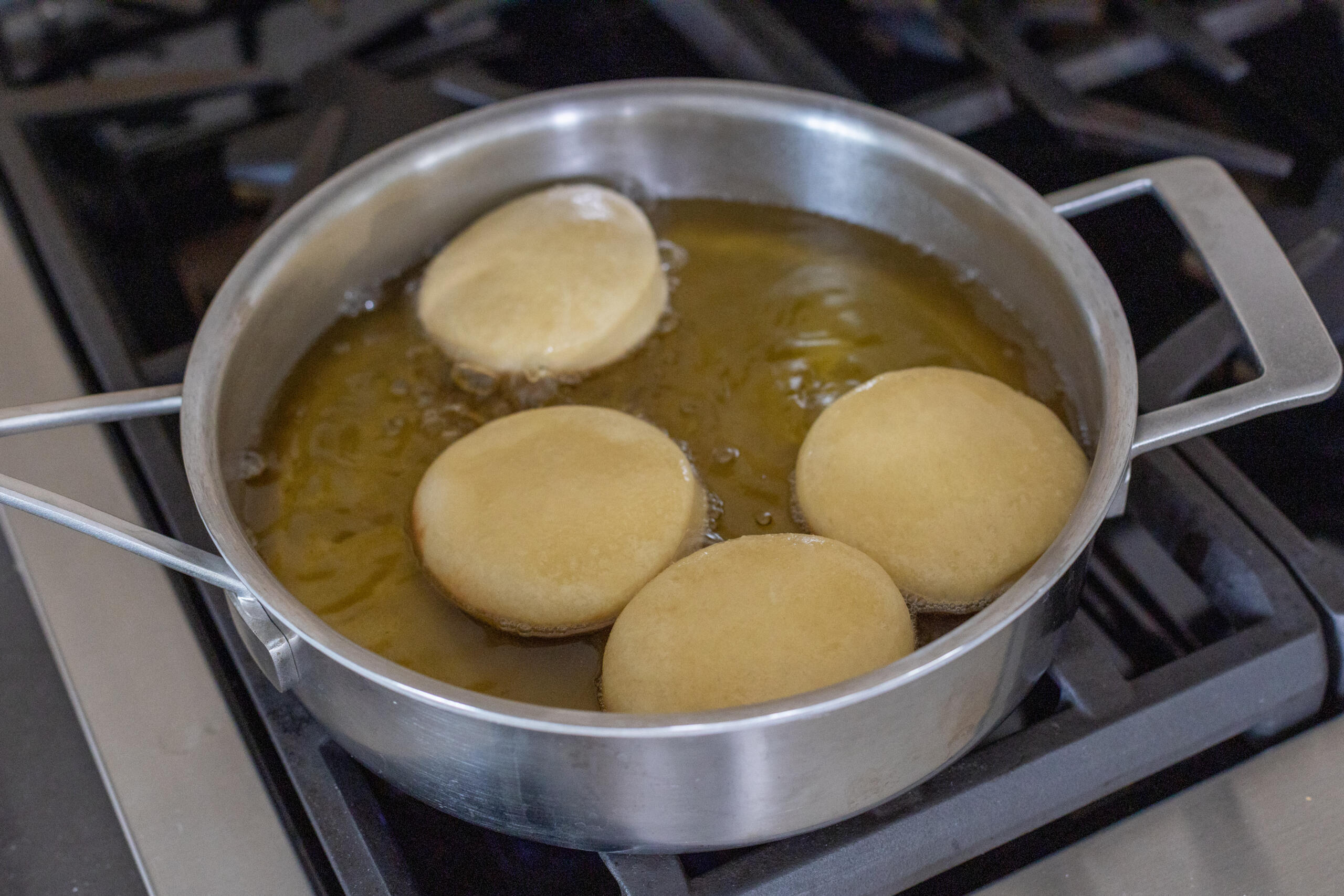 - Allow the donuts to fry undisturbed. Avoid splashing any oil on top of the donuts before flipping — the top needs to stay dry in order to puff up and form that classic white “ring”.