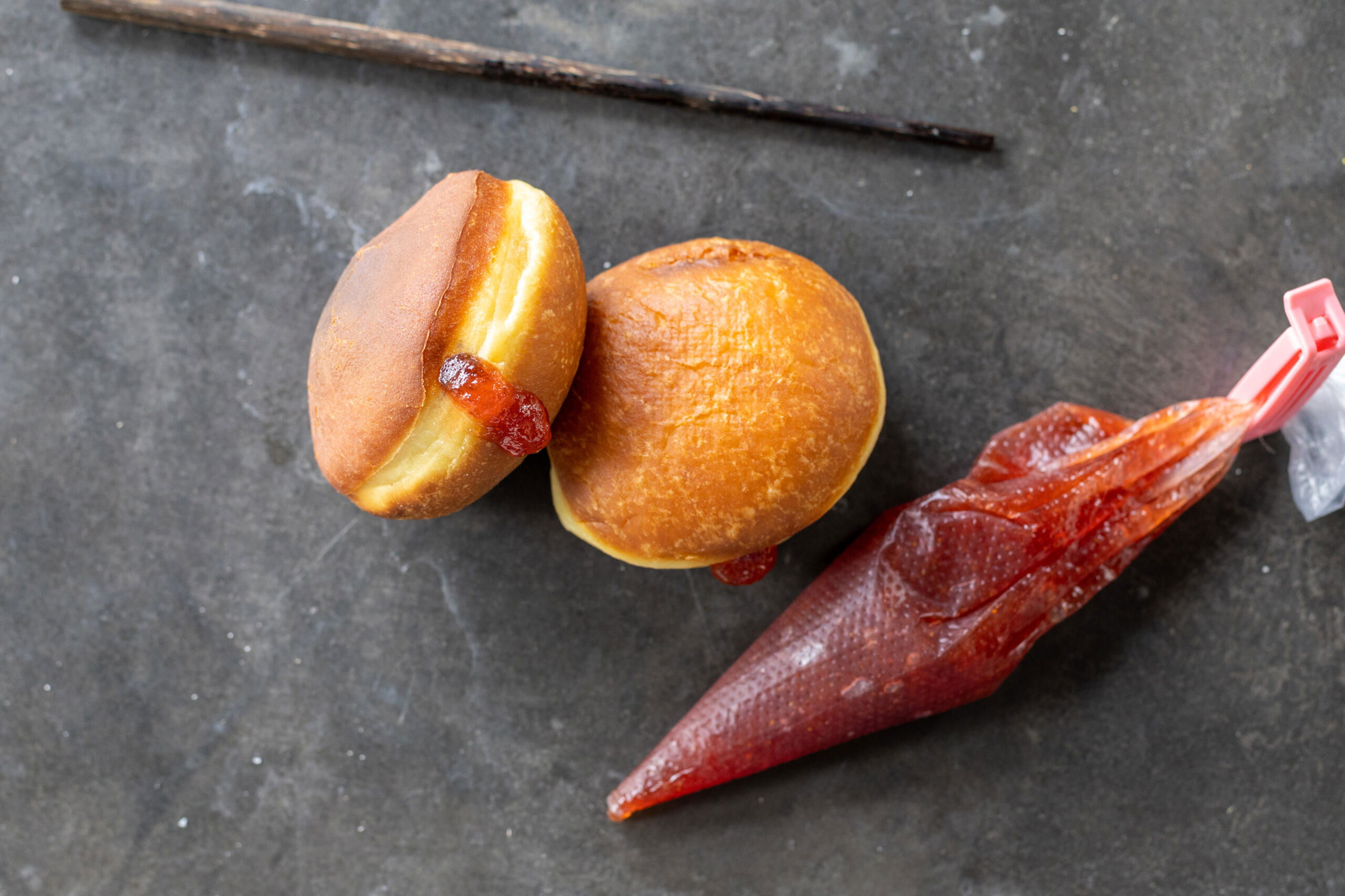 - Fill each donut with jam using a piping bag fitted with a long tip.