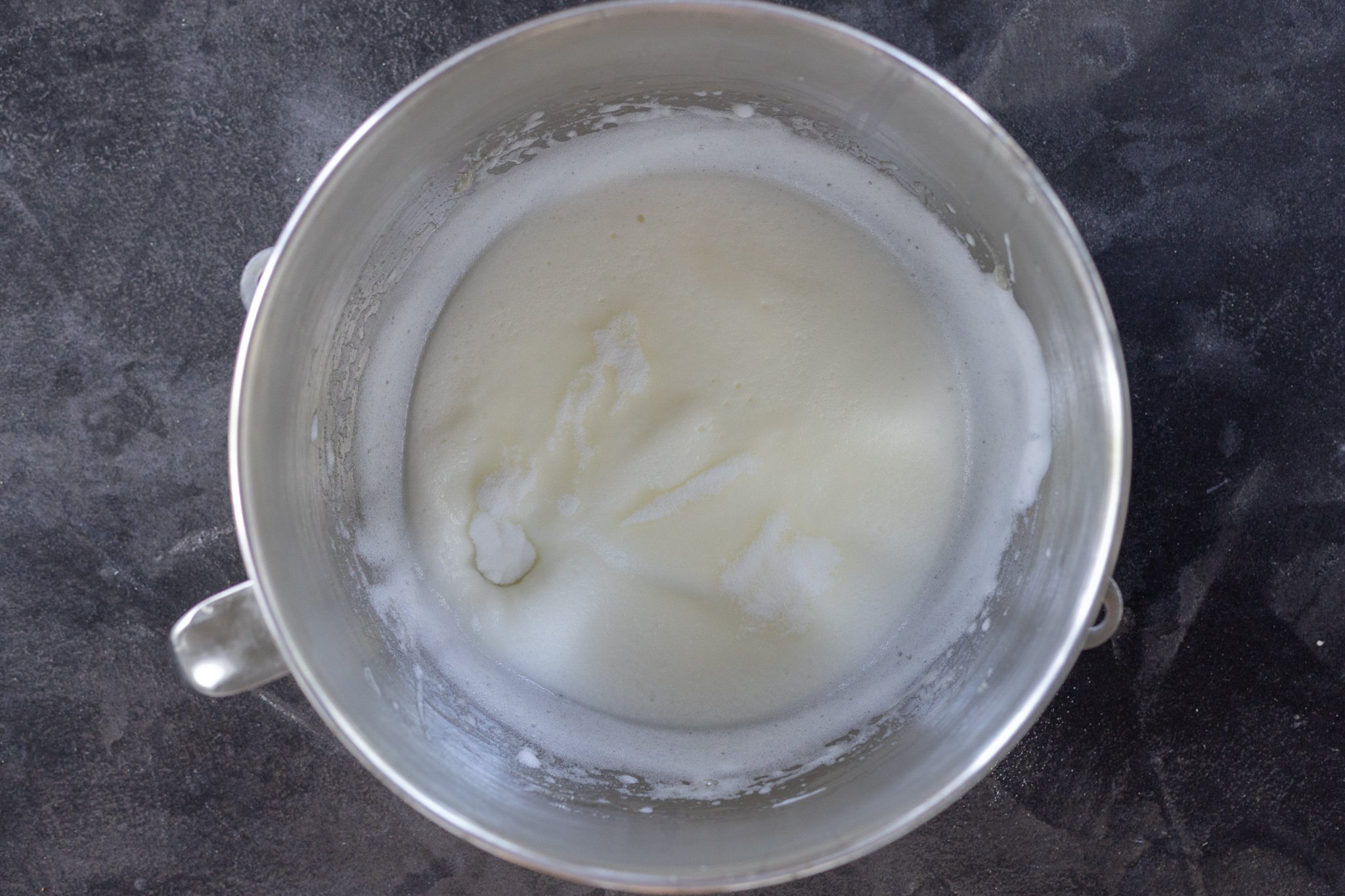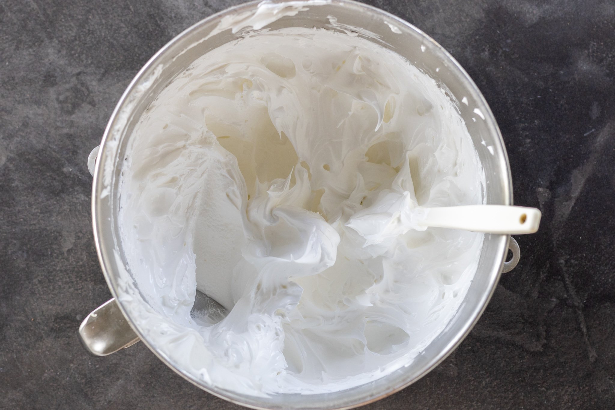 - In the bowl of a stand mixer, add the egg whites and cream of tartar. Beat on high speed using the whisk attachment until the whites are frothy and soft peaks form. Continue whisking on medium-high speed, adding the sugar about one tablespoon at a time.
