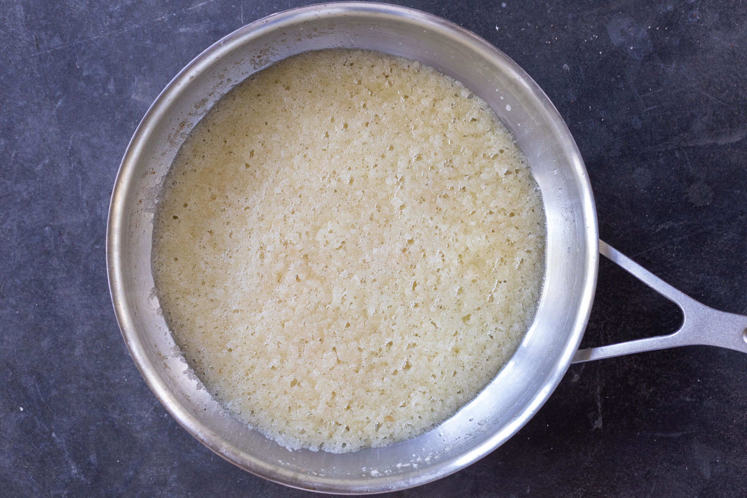 - Melt the butter in a 10-inch oven-safe skillet over low heat. Add the sugar and salt and cook until the mixture is golden.