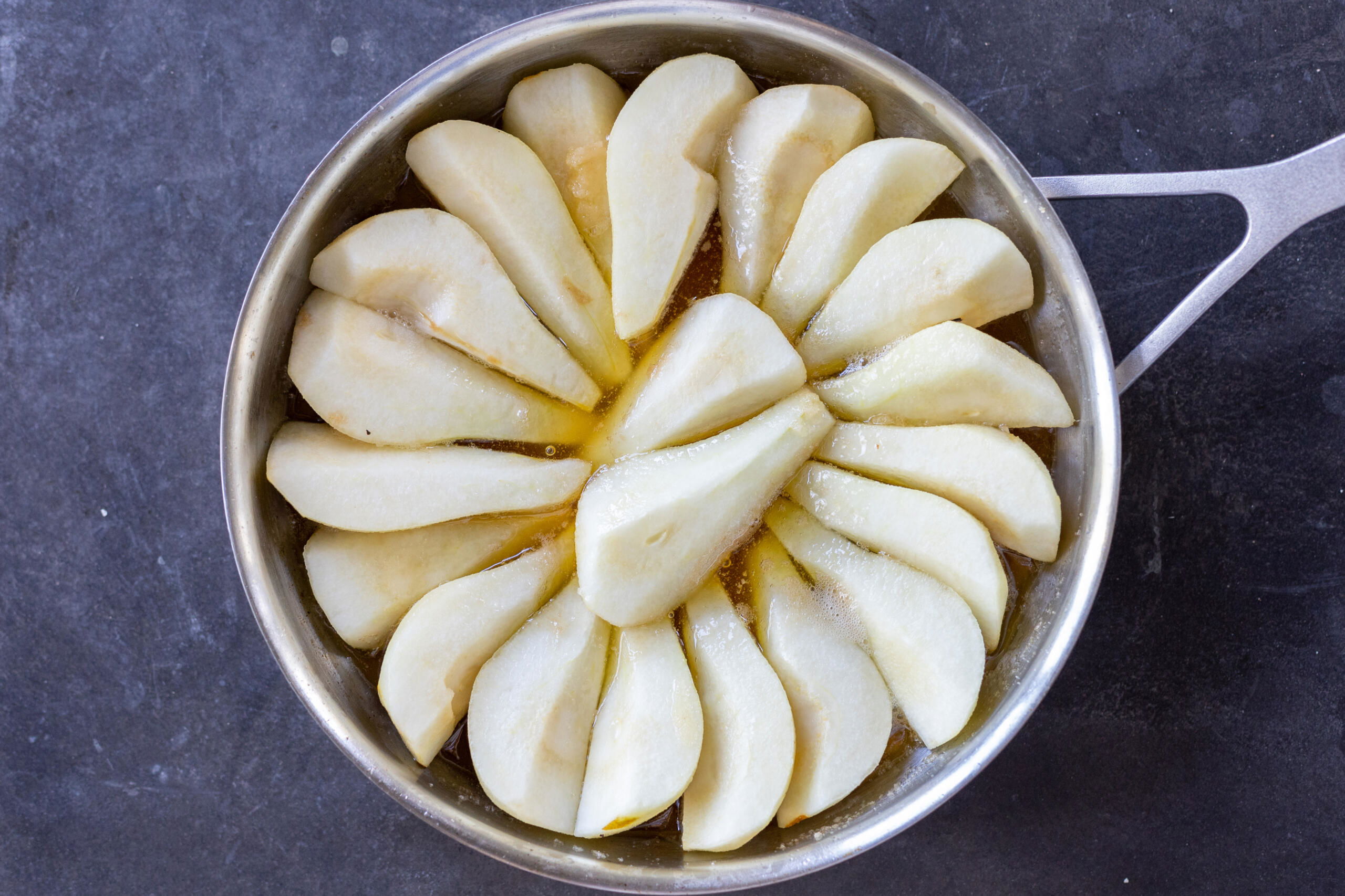 - Arrange the quartered pears in the caramel (rounded-side down and tightly packed together). Cook the pears over medium heat on the stove until they are softened and the caramel is a deep golden color, about 30–40 minutes.
