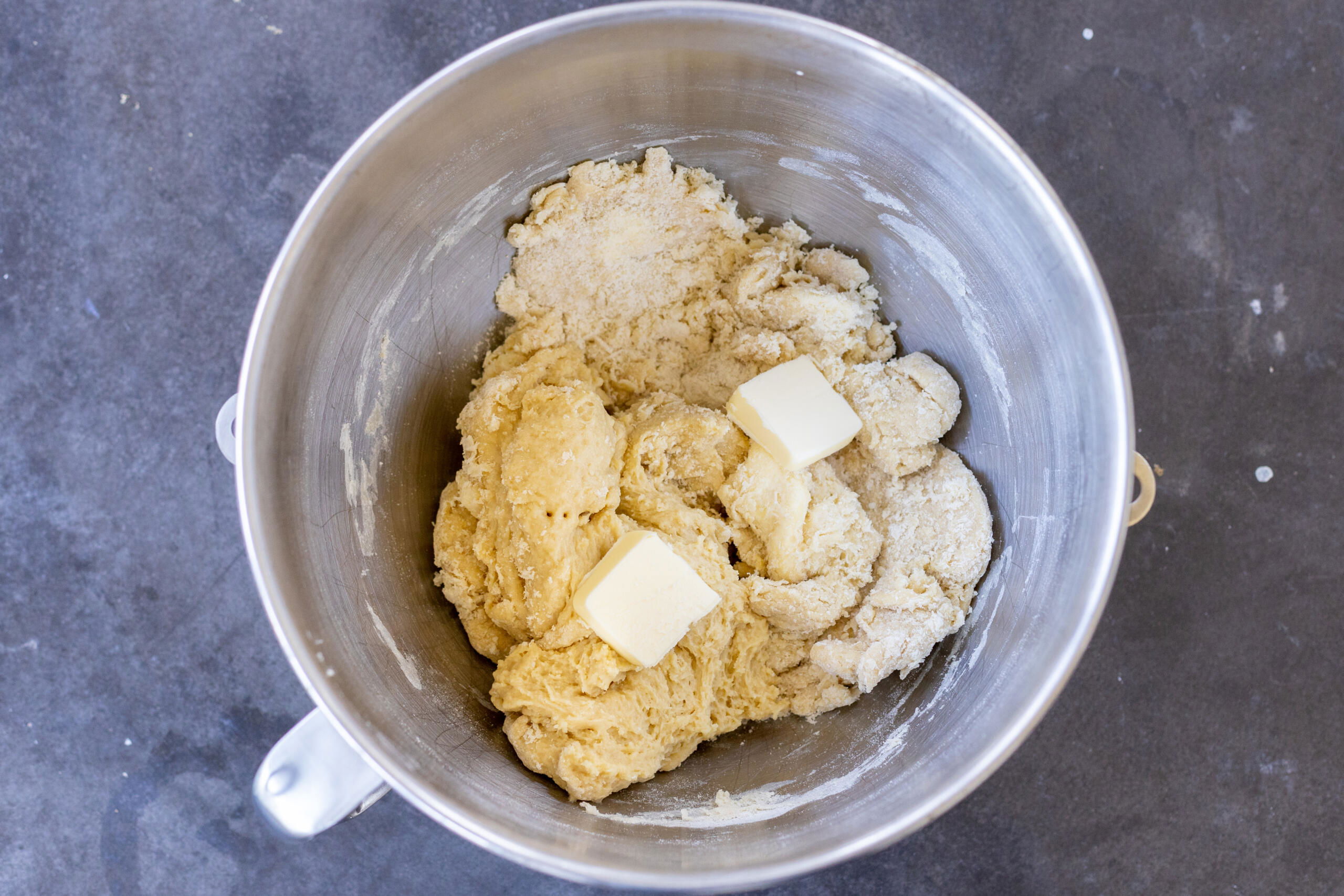 - Make the dough: In the bowl of a stand mixer fitted with the dough hook, mix together all the dough ingredients except the butter. Add the softened butter in cubes and knead until the dough is elastic.