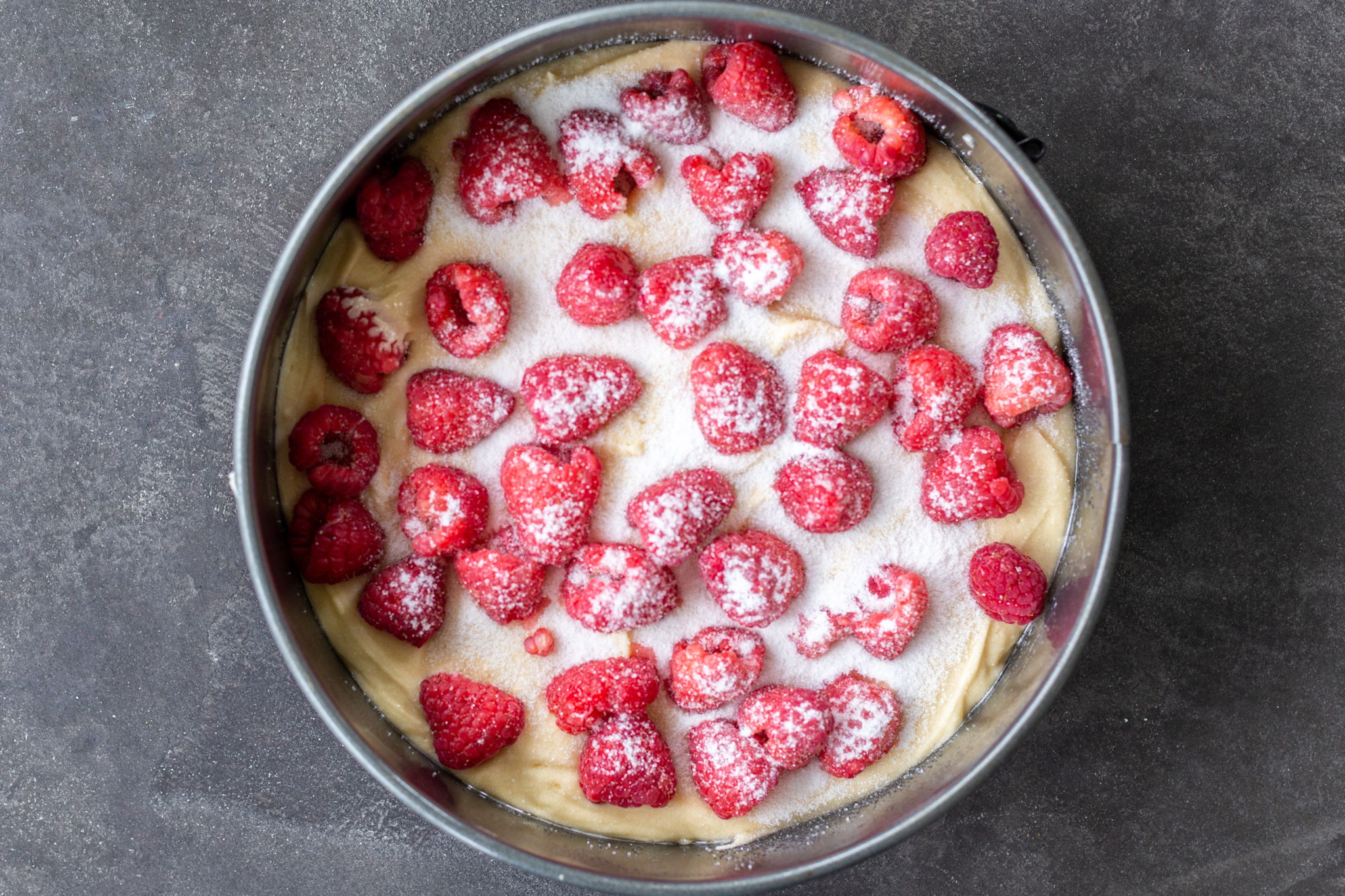 - Assemble the coffee cake: Spread the cake batter into a greased six or nine-inch cake pan. Spread the raspberries on top and sprinkle on a bit of sugar.