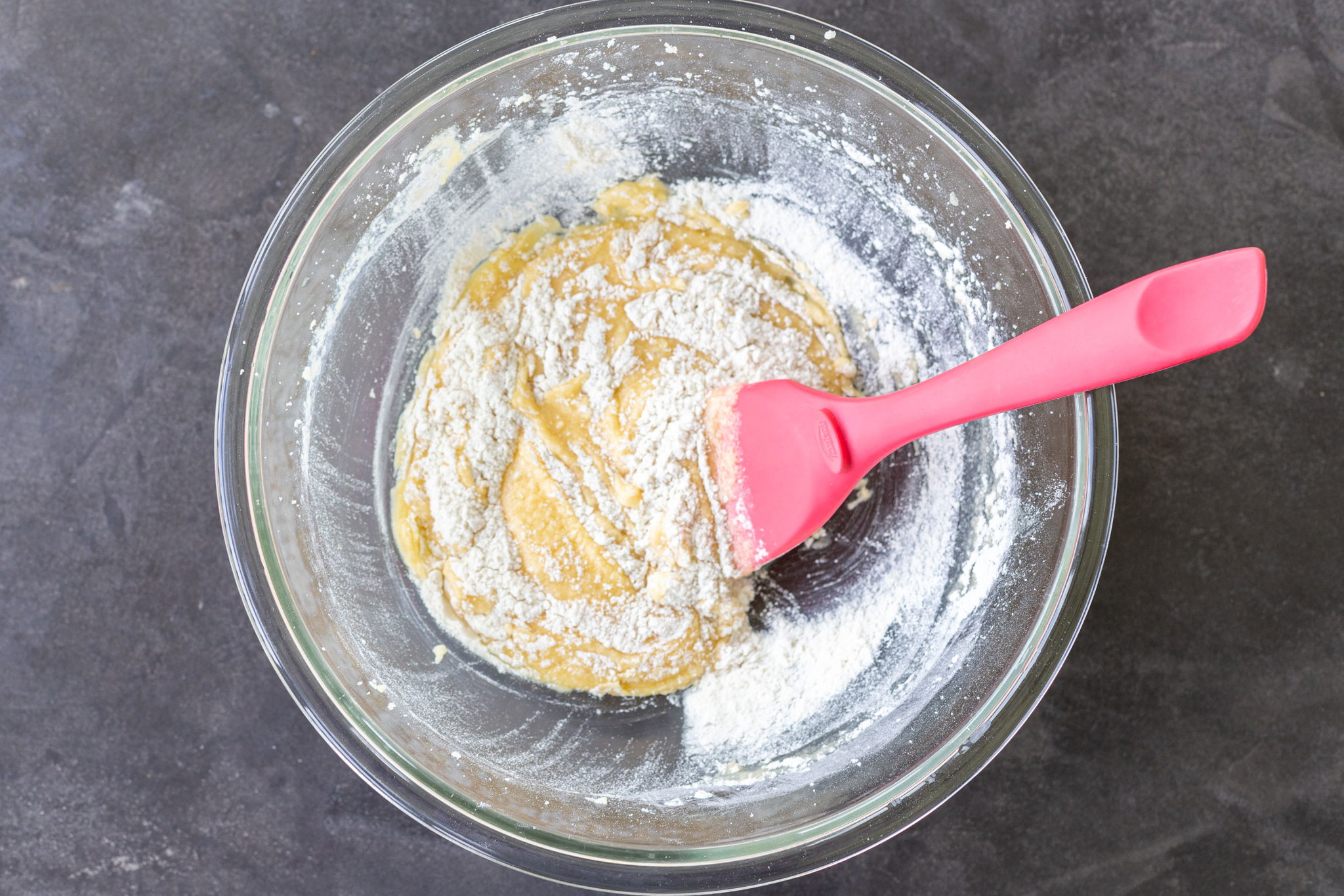 - In small portions, add in the flour mixture, followed by the milk. Repeat until you run out of flour and milk. Beat until well-combined.