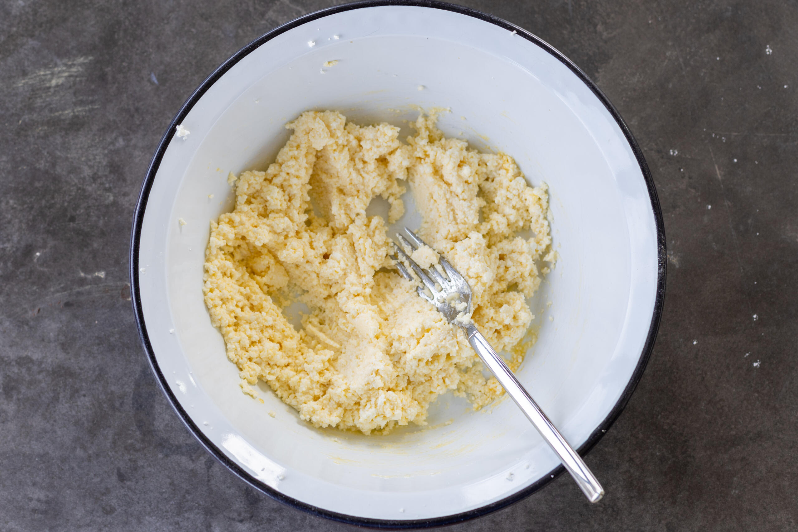 - In a large bowl, combine the farmer’s cheese, egg, sugar, salt, and vanilla extract. Use a fork to mix everything together, creating a smooth and even consistency.
